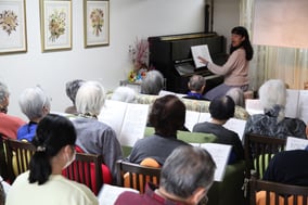毎年成城ホールで行われている成城さくら音楽祭に向けての練習もかねて、ジャズボーカリストの菊池先生がピアノで奏でるメロディーに合わせて歌います。